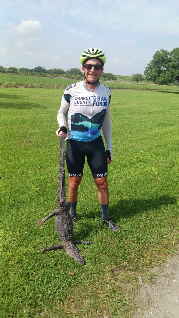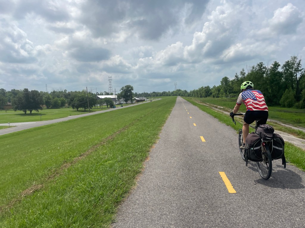 We went through Baton Rouge and connected with the Mississippi River bike path. It was on top of the levee by the river. We also saw the LSU campus nearby while we stopped for lunch on by the bike path.