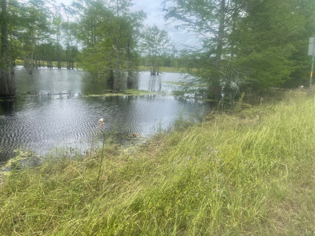 My Big breakfast! Couldn’t quite finish the pancakesStu’s grill where we had breakfast Mulch plant we passedMore wildflowers More flooding. This is Calcasieu River. RVs in the trees were flooded. Ryan, the local fire chief, had just finished mowing around the fire house when we arrived