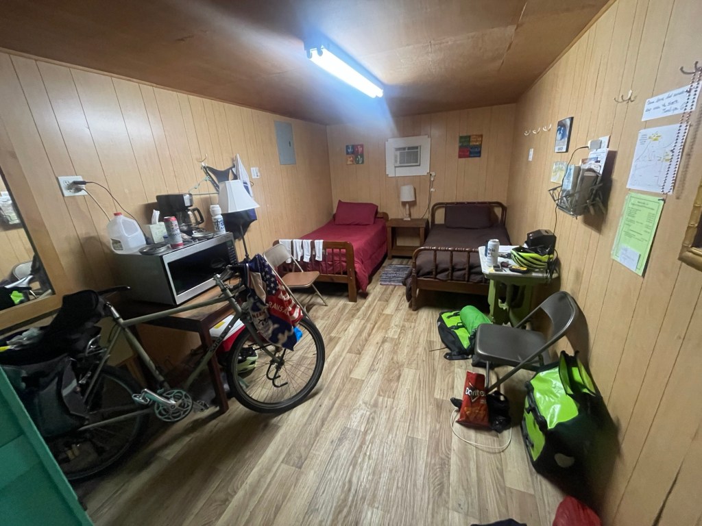 Our sleeping quarters last night. The old fire station Rice? Fields with with crawfish traps that the egrets loved to perch onThis spray plane landed and took on a load of product right as we passed byOne of our typical local store stops for a soda and snacks. We are a bit proud that we haven’t stopped at any dollar store Chicot state park roadChicot state parkEvening accommodations Fire station lobby. Where we slept. Craig on the couch because his mattress pad malfunctioned.