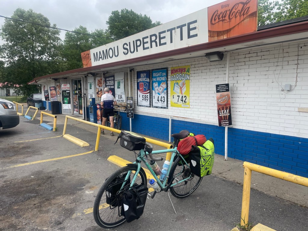 Humid and overcast made for a soaking wet jersey again for me. No hills at all. I had a problem from the start when one of my bungie cords holding my tent on got wrapped around my back derailleur and while it didn’t cause any damage it took a while to untangle.